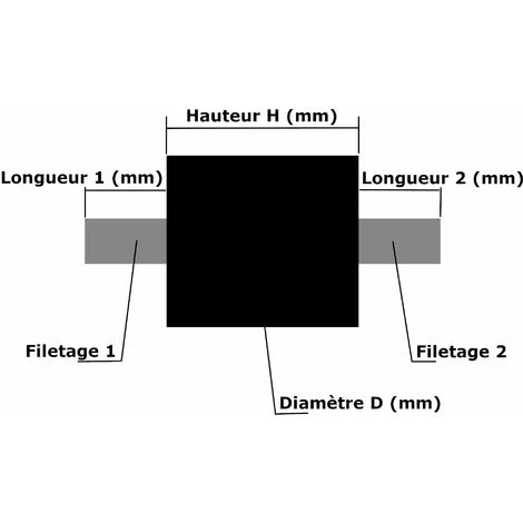 Lot de deux silent bloc mâle/mâle ; Diamètre D = 20mm ; Hauteur H = 15mm ; Filetage 1 = M6 ; Longueur 1 = 18mm ; Filetage 2 = M6 ; Longueur 2 = 18mm ; Dureté = 55 (Shore A) ; Compression maximale = 15 % de la hauteur ; caoutchouc ;