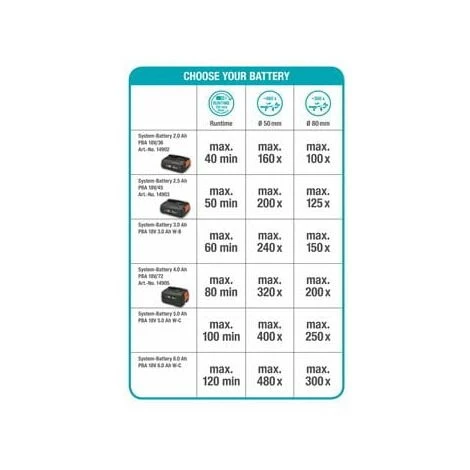 - Temps te travail : jusqu’à 480 branches de 50 mm de diamètre en une seule charge (en fonction de la batterie choisie)