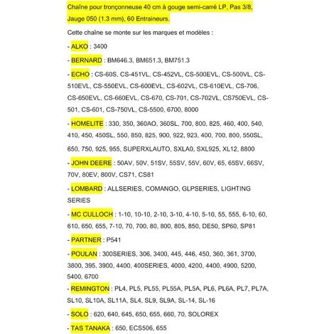 Chaîne Professionnelle 40cm pour tronçonneuse, Pas 3/8, jauge 050/1,3mm, 60 Entraineurs. Correspondance Oregon 72-60E. Cette chaîne pour tronçonneuse de 40 cm se monte sur Alko, Bernard, Echo, Homelite, John Deere, Lombard, Mc Culloch, Partner, Poulan, Remington, Solo, Tas Tanaka. Voir tableau d’affectation par marque et modèle en photo ou nous contacter pour vérifier avant commande.
