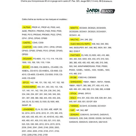 La chaine Oregon 21PX066E est une chaine de haute qualité professionnelle à dents demi-rondes, la qualité de son acier lui offre une grande résistance à l’usure et un affutage facile pour répondre aux utilisateurs les plus exigeants. Pas de la chaine 325, Jauge 058 soit 1.5mm, 66 maillons entraineurs (dents qui entrent dans le guide). Une chaine de qualité c’est une vitesse de travail plus élevée, moins d’effort pour la tronçonneuse et son utilisateur et une durée de vie accrue. ATTENTION : Merci de respecter notre tableau d’affectation en photo sur la fiche produit