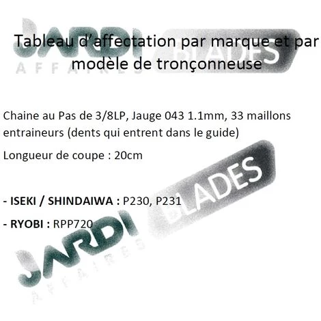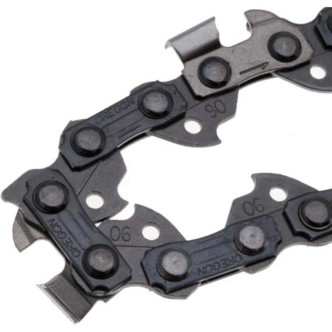 La chaine Oregon 90PX033E est une chaine de haute qualité professionnelle à dents demi-rondes, la qualité de son acier lui offre une grande résistance à l’usure et un affutage facilité et d’une grande tenue pour répondre aux utilisateurs les plus exigeants. Se monte principalement sur Iseki, Shindaiwa et Ryobi (voir tableau d’affectation en photo) Pas de la chaine 3/8LP, Jauge 043 soit 1.1mm, 33 maillons entraineurs. Une chaine de qualité c’est une vitesse de travail plus élevée, moins d’effort pour la tronçonneuse et son utilisateur et une durée de vie accrue.