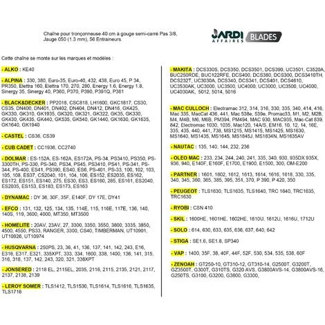 La chaine Oregon 91PX056E est une chaine de haute qualité professionnelle à dents demi-rondes, la qualité de son acier lui offre une grande résistance à l’usure et un affutage facile pour répondre aux utilisateurs les plus exigeants. Pas de la chaine 3/8LP, Jauge 050 soit 1.3mm, 56 maillons entraineurs (dents qui entrent dans le guide). Une chaine de qualité c’est une vitesse de travail plus élevée, moins d’effort pour la tronçonneuse et son utilisateur et une durée de vie accrue. ATTENTION : Merci de respecter notre tableau d’affectation en photo sur la fiche produit