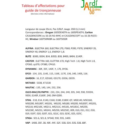 Ensemble comprenant 1 guide Pro 35cm + 4 chaînes pour tronçonneuse 50 maillons entraineurs Pas 3/8 jauge 0.50 (1.3mm). Correspondances Oregon : Guide 140SPEA074, Chaînes 91-50E, se monte sur les marques ALPINA, BLITZ, CASTOR, DYNAMAC, EFCO, GARDEN, METABO, NAUTAC, OLEO MAC, OLYMPYK, STIHL, STIGA, VAP, voir tableau d’affectation en photo. Découvrez également notre kit 1 guide + 1 chaine 50 maillons entraineurs ou guide vendu seul.