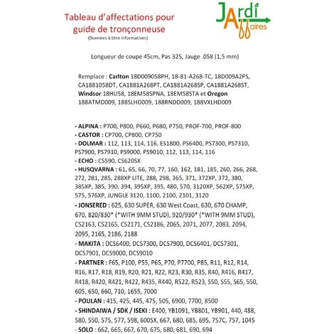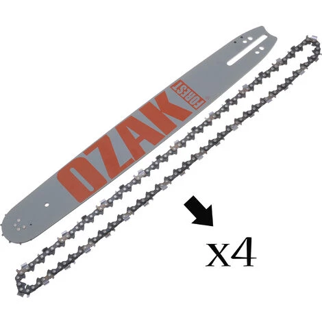 Combo comprenant 1 guide Ozaki 45cm de coupe livré avec 4 chaînes Ozaki Pas 3/8, Jauge 050/1,5mm 68 maillons pour tronçonneuse des marques suivantes Alpina, Castor, Dolmar, Echo, Husqvarna, Jonsered, Makita, Partner, Poulan, Iseki et Shindaiwa. Correspondances guide Carlton 18D009058PH, 18-81-A268-TC, 18D009A2PS, CA1881058DT, CA1881A268PT, CA1881A268SP, CA1881A268ST, Windsor 18HU58, 18EM58SPNA, 18EM58STA et Oregon 188ATMD009, 188SLHD009, 188RNDD009, 188VXLHD009 Ce guide et cette chaîne de 45cm sont également proposé seul au détail ou en lot 1 guide + 1 chaine. Merci de vous référer au tableau d’affectation par marques et modèles de tronçonneuse afin de ne pas commettre d’erreur.