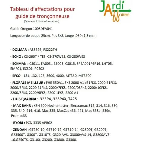 Guide Oregon 100SDEA041 longueur de coupe de 25cm Pas 3/8LP, Jauge 1,3mm (050) pour tronçonneuse élagueuse. Ce guide Oregon se monte principalement sur les tronçonneuses Dolmar, Echo, Eckman, Efco, Florale Meilleur, Husqvarna, Max Bahr, Ryobi et Zenoah. Merci de respecter notre tableau d’affectation par modèle ou de nous contacter avant de commander un guide qui pourrait ne pas convenir à votre tronçonneuse car il existe des centaines de montages différents au niveau des fixations.
