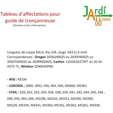 Guide 50cm semi- professionnel pour tronçonneuse Pas 3/8, Jauge 1,6mm (.063) correspondances Oregon 203SLHD025 ou 203SFHD025 ou 203ATMD025 ou 203RNDD025, Carlton CA2042A372PT ou 20-42-A372-TC, Windsor 204063SPNA. Ce guide se monte les tronçonneuses Stihl, AEG et Logosol. Voir tableau d’affectation en photo. Disponible en Combo avec 1 chaine ou Combo 4 chaînes 72 maillons entraineurs. Voir tableau d’affectation en photo ou nous contacter en cas de doute.