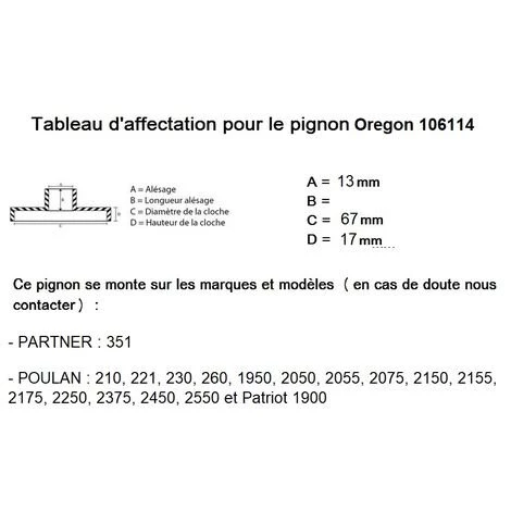 Pignon de chaine Oregon référence 106114, Pas 3/8LP avec entrainement à 6 dents. Ce pignon remplace la référence constructeur 530047061 et se monte principalement sur les tronçonneuses Partner 351 ou Poulan 210, 221, 230, 260, 1950, 2050, 2055, 2075, 2150, 2155, 2175, 2250, 2375, 2450, 2550 et Patriot 1900 ATTENTION : Merci de vérifier votre Pas de chaine et de respecter les marques et modèles indiqués dans notre description. Dimensions : Diamètre intérieur (sans roulement) 13mm, diamètre extérieur de la cloche 67mm, hauteur extérieur de la cloche : 17mm, hauteur total 27,2mm