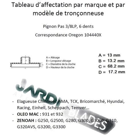 Pignon Professionnel pour tronçonneuse Zenoah, Oleo Mac et élagueuse 25cc de fabrication Chinoise (AMA, TCK, Bricomarché, Hyundai, Racing, Einhell, Scheppach, Temver…). Entrainement à 6 dents, Pas 3/8LP. Ce pignon peut remplacer la référence Oregon 104440X et se monte uniquement sur les marques Zenoah et Oleo Mac, il remplace la pièce d’origine sans modification. ATTENTION : Merci de respecter notre tableau d’affectation en photo sur la fiche produit et de vérifier vos dimensions avant de commander.