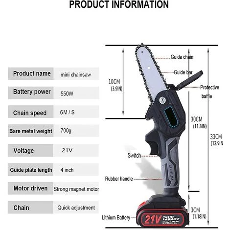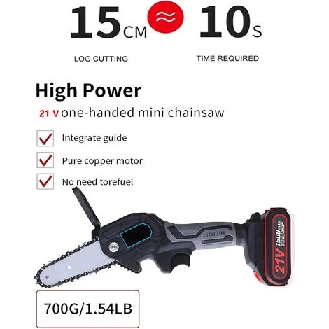 Coupure de courant. Alimenté par une batterie au lithium haute énergie 21 V, 1,5 Ah*2 et peut fonctionner pendant 50 à 60 minutes. La puissante vitesse du moteur peut atteindre 6 m / s et la puissance de sortie de 550 w peut couper des bûches d’un diamètre de 4 pouces en 10 s.