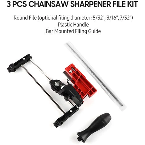 Kit de 3 pièces : une lime ronde en acier (diamètre de lime en option : 5/32″, 3/16″, 7/32″), une poignée en plastique, un guide de lime monté sur barre.