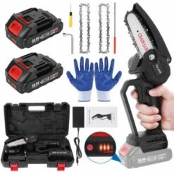 【 TRONCONNEUSE SANS FIL PLUS PRATIQUE】En raison de son poids léger, de ses faibles vibrations, la mini tronçonneuse sans fil peut être utilisée d’une seule main, elle peut également être facilement contrôlée et utilisée par les femmes. Nous sommes également équipés d’une boîte de rangement portable qui est facile à ranger et à transporter. L’ensemble des tronçonneuses électriques a été installé, il vous suffit d’installer la batterie et d’ajuster le serrage de la chaine.